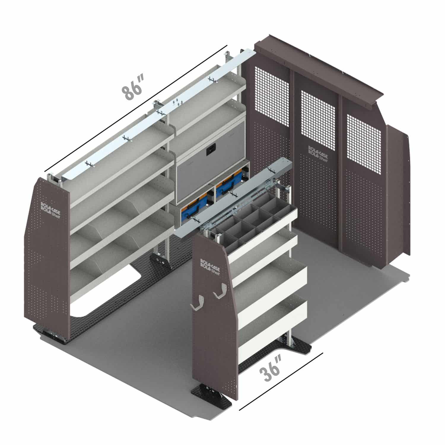 Van shelving Ram Promaster General Bin Package with Standard Set back Partition & Anchor kit for the Ram Promaster 118″ WB Standard Roof
