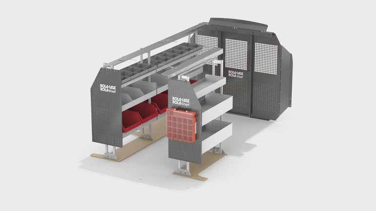 RolaCase RolaShelf Van shelving Americas Most Popular Bin package with Standard Set back Partition & Roof and Floor Anchor Kit.
